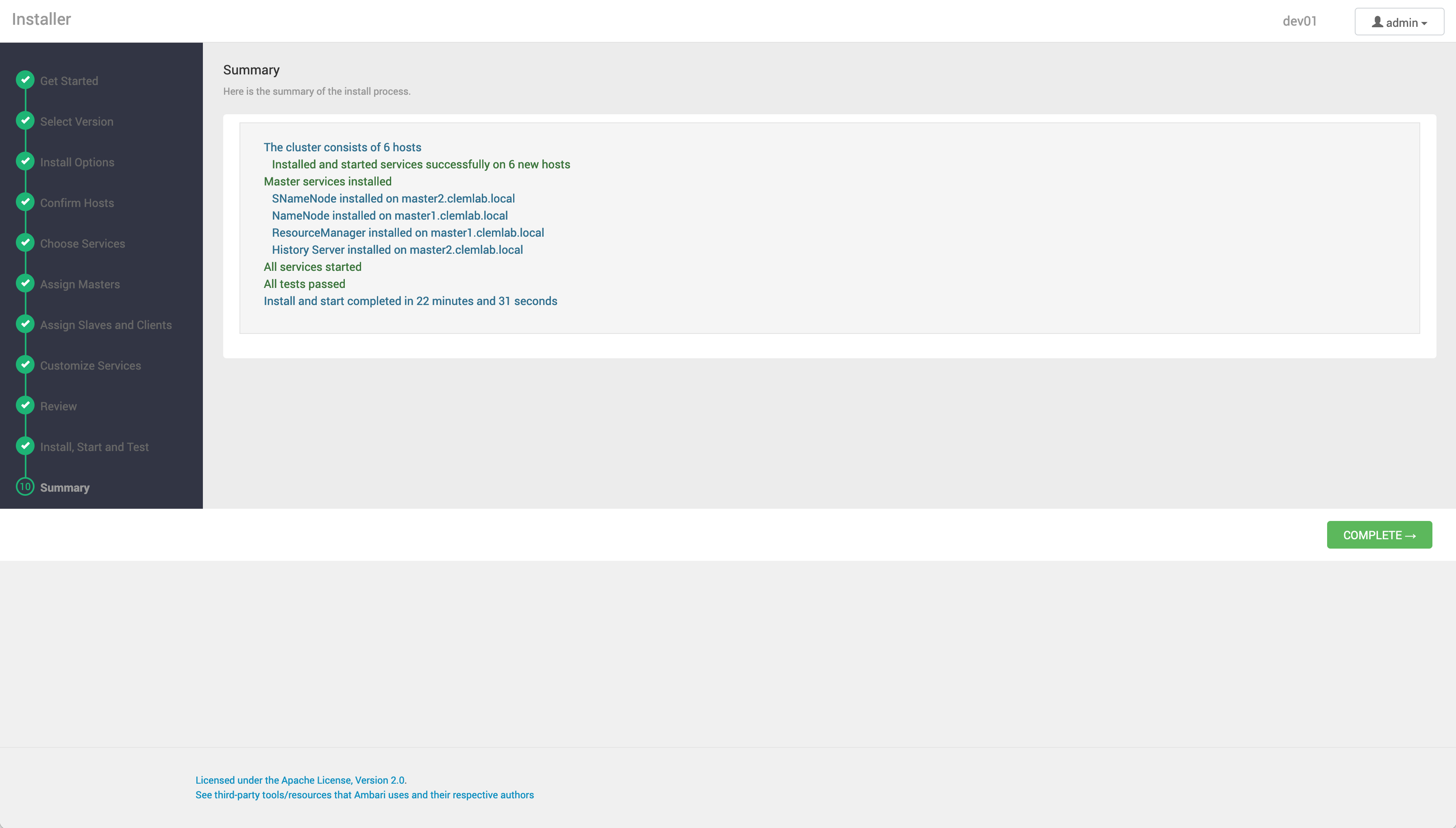 Choose Complete. Ambari Web opens in your web browser.