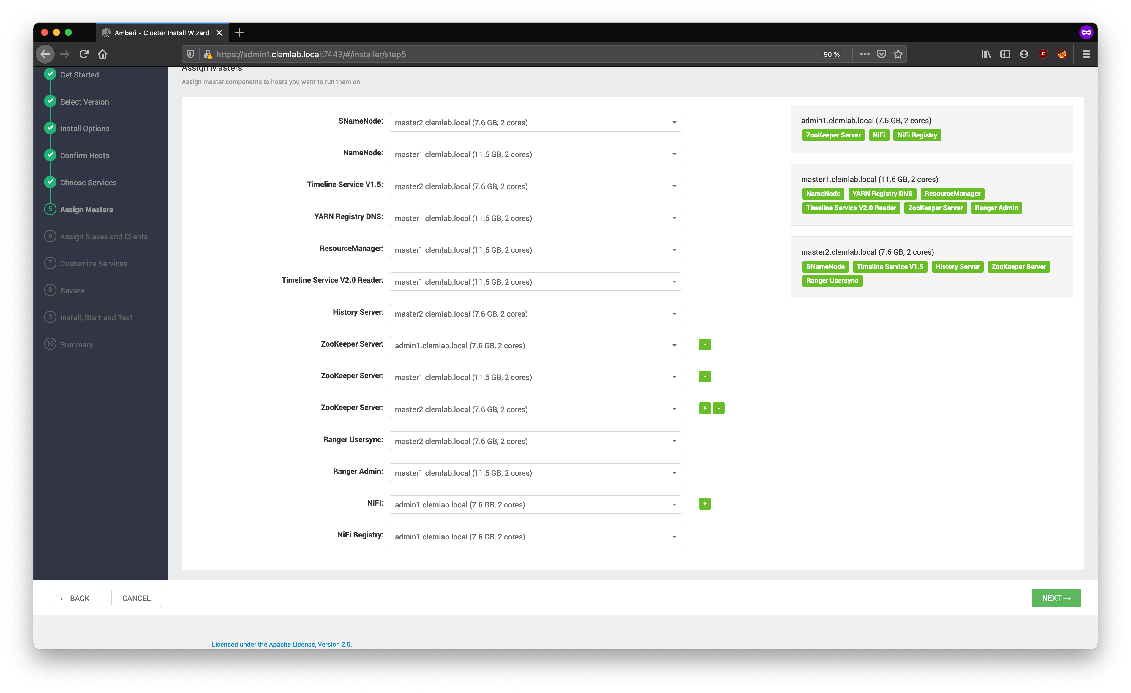 The Cluster Installation Wizard assigns the master components of the selected services to the appropriate hosts in your cluster and displays the assignments in Assign Masters.