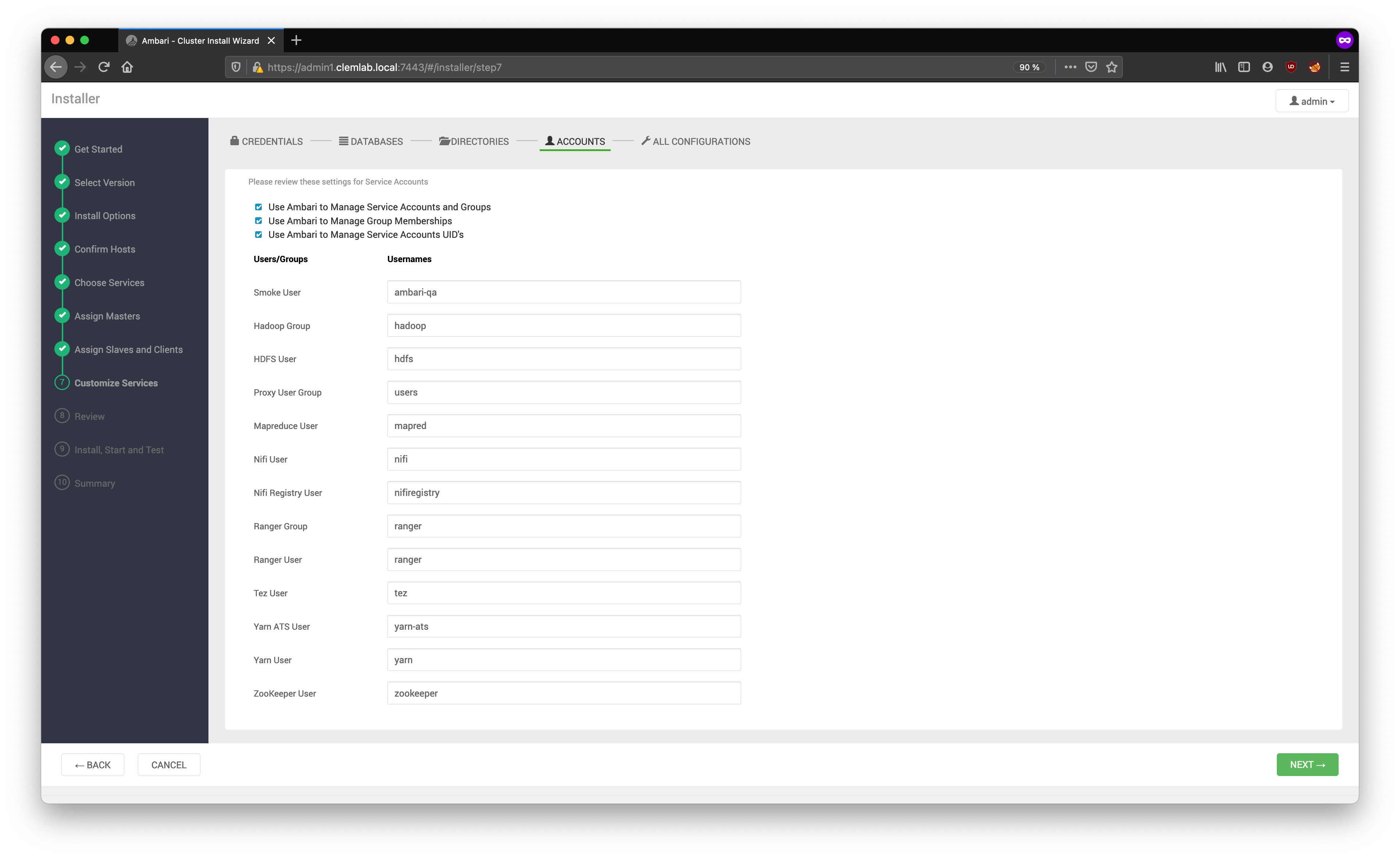 Les utilisateurs et groupes du compte de service sont également configurables à partir de l'onglet Comptes. Il s'agit des comptes du système d'exploitation sous lesquels les composants du service s'exécuteront. Si ces utilisateurs n'existent pas sur vos hôtes, Ambari créera automatiquement les utilisateurs et les groupes localement sur les hôtes. Si ces utilisateurs existent déjà, Ambari utilisera ces comptes.